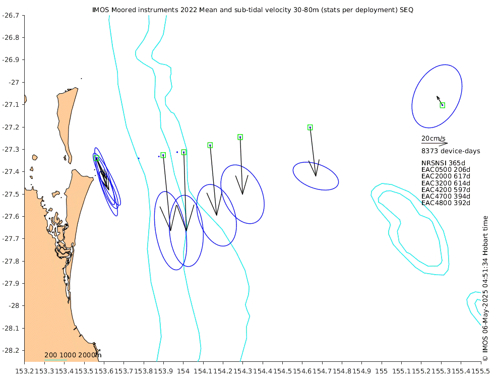 These maps show some basic analyses of the velocity data: mean (all-time in black and seasonal in colour) and sub-tidal variance for several layers and time-windows, and tidal harmonics for the depth-average velocity using the whole record. Click through to see more detailed plots of the selected dataset or to download those data from the AODN thredds server.