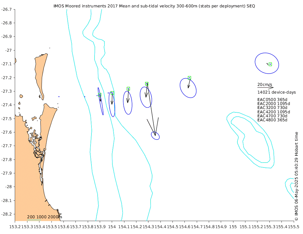 These maps show some basic analyses of the velocity data: mean (all-time in black and seasonal in colour) and sub-tidal variance for several layers and time-windows, and tidal harmonics for the depth-average velocity using the whole record. Click through to see more detailed plots of the selected dataset or to download those data from the AODN thredds server.