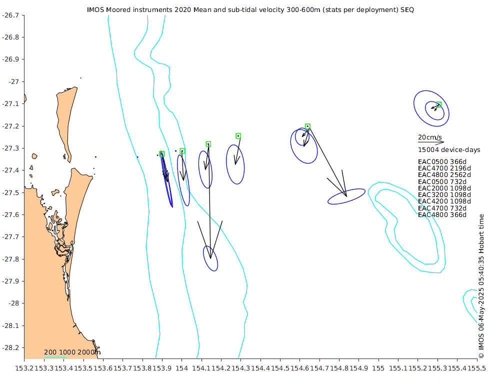 These maps show some basic analyses of the velocity data: mean (all-time in black and seasonal in colour) and sub-tidal variance for several layers and time-windows, and tidal harmonics for the depth-average velocity using the whole record. Click through to see more detailed plots of the selected dataset or to download those data from the AODN thredds server.
