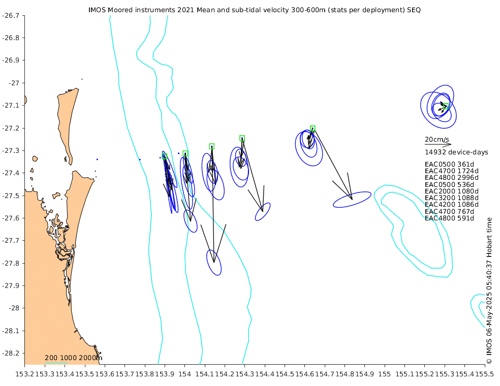 These maps show some basic analyses of the velocity data: mean (all-time in black and seasonal in colour) and sub-tidal variance for several layers and time-windows, and tidal harmonics for the depth-average velocity using the whole record. Click through to see more detailed plots of the selected dataset or to download those data from the AODN thredds server.