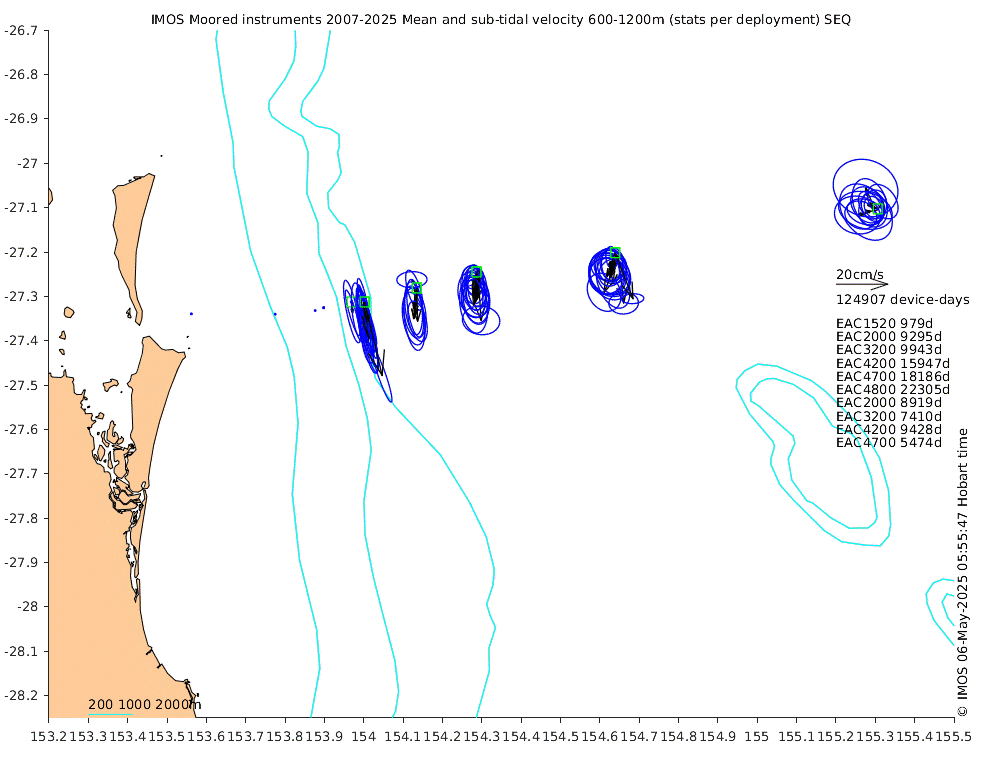 These maps show some basic analyses of the velocity data: mean (all-time in black and seasonal in colour) and sub-tidal variance for several layers and time-windows, and tidal harmonics for the depth-average velocity using the whole record. Click through to see more detailed plots of the selected dataset or to download those data from the AODN thredds server.