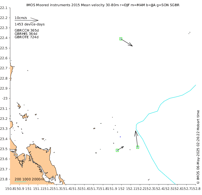 These maps show some basic analyses of the velocity data: mean (all-time in black and seasonal in colour) and sub-tidal variance for several layers and time-windows, and tidal harmonics for the depth-average velocity using the whole record. Click through to see more detailed plots of the selected dataset or to download those data from the AODN thredds server.