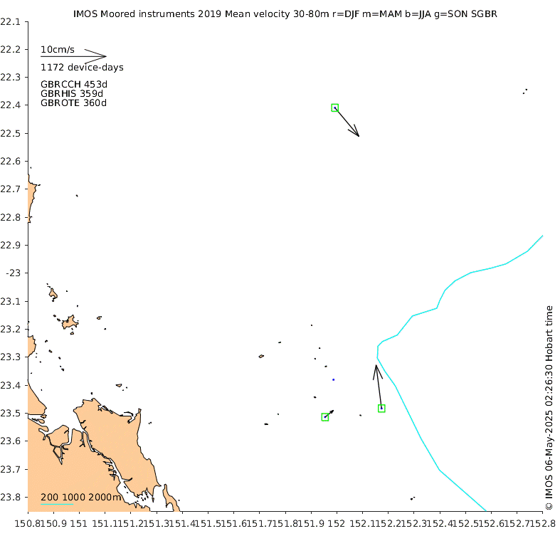 These maps show some basic analyses of the velocity data: mean (all-time in black and seasonal in colour) and sub-tidal variance for several layers and time-windows, and tidal harmonics for the depth-average velocity using the whole record. Click through to see more detailed plots of the selected dataset or to download those data from the AODN thredds server.