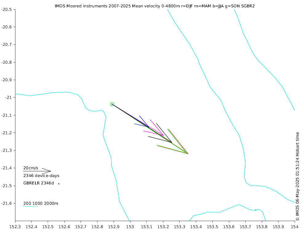 These maps show some basic analyses of the velocity data: mean (all-time in black and seasonal in colour) and sub-tidal variance for several layers and time-windows, and tidal harmonics for the depth-average velocity using the whole record. Click through to see more detailed plots of the selected dataset or to download those data from the AODN thredds server.
