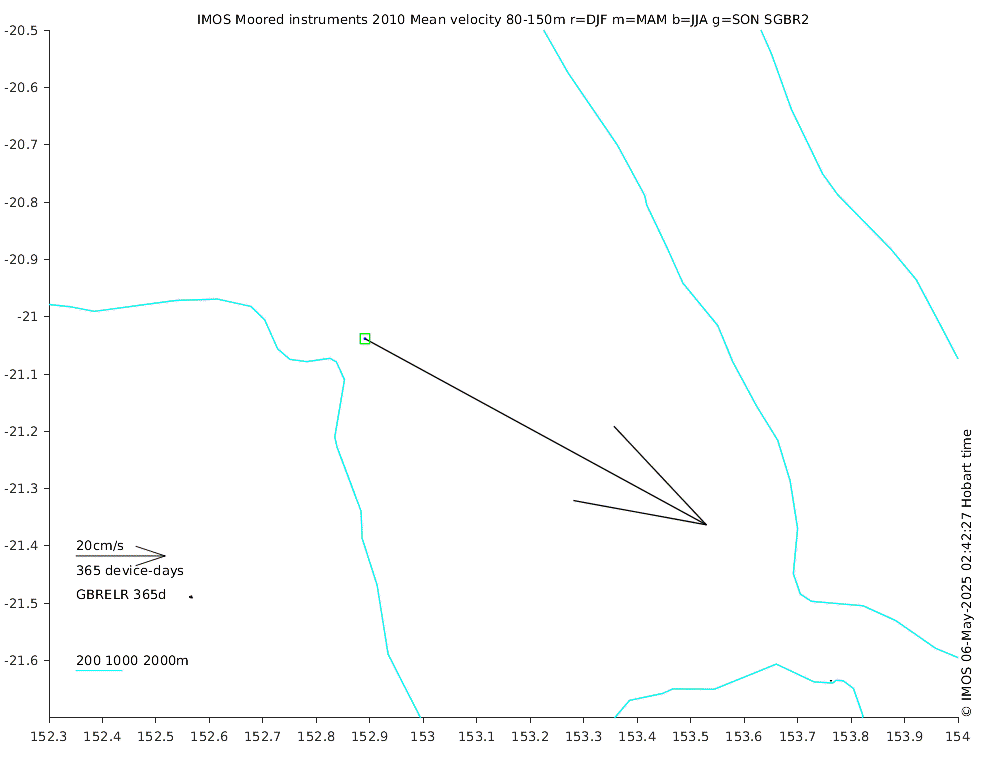 These maps show some basic analyses of the velocity data: mean (all-time in black and seasonal in colour) and sub-tidal variance for several layers and time-windows, and tidal harmonics for the depth-average velocity using the whole record. Click through to see more detailed plots of the selected dataset or to download those data from the AODN thredds server.