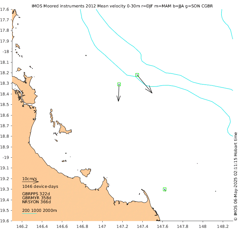 These maps show some basic analyses of the velocity data: mean (all-time in black and seasonal in colour) and sub-tidal variance for several layers and time-windows, and tidal harmonics for the depth-average velocity using the whole record. Click through to see more detailed plots of the selected dataset or to download those data from the AODN thredds server.