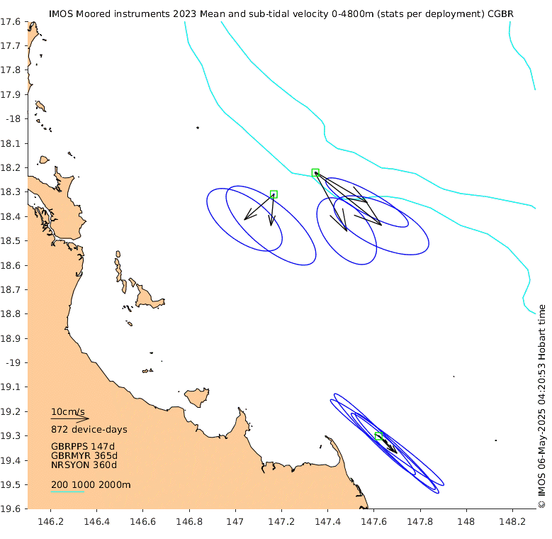 These maps show some basic analyses of the velocity data: mean (all-time in black and seasonal in colour) and sub-tidal variance for several layers and time-windows, and tidal harmonics for the depth-average velocity using the whole record. Click through to see more detailed plots of the selected dataset or to download those data from the AODN thredds server.