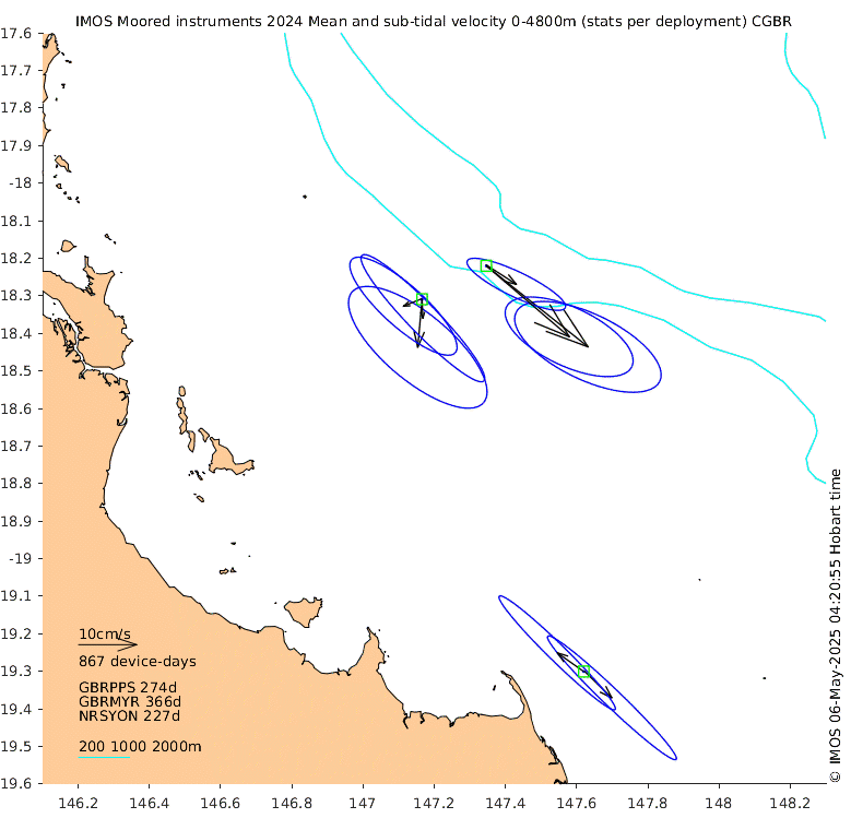 These maps show some basic analyses of the velocity data: mean (all-time in black and seasonal in colour) and sub-tidal variance for several layers and time-windows, and tidal harmonics for the depth-average velocity using the whole record. Click through to see more detailed plots of the selected dataset or to download those data from the AODN thredds server.