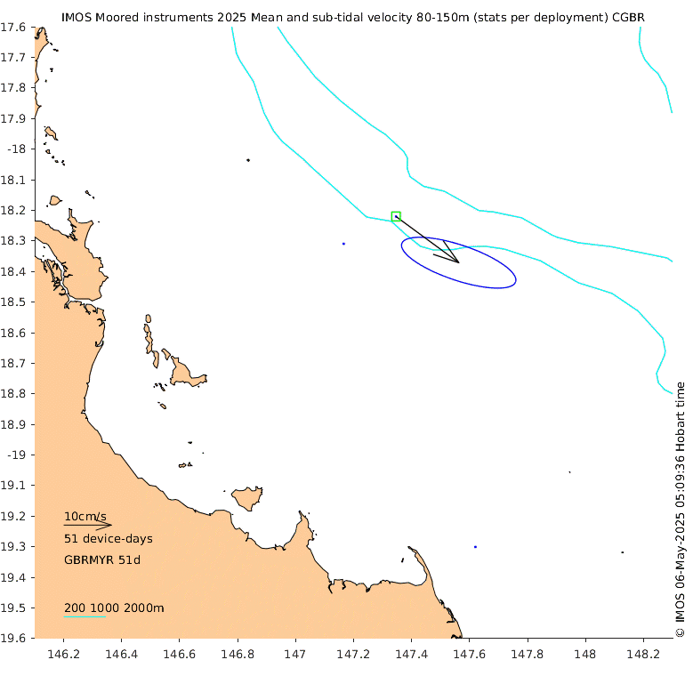 These maps show some basic analyses of the velocity data: mean (all-time in black and seasonal in colour) and sub-tidal variance for several layers and time-windows, and tidal harmonics for the depth-average velocity using the whole record. Click through to see more detailed plots of the selected dataset or to download those data from the AODN thredds server.