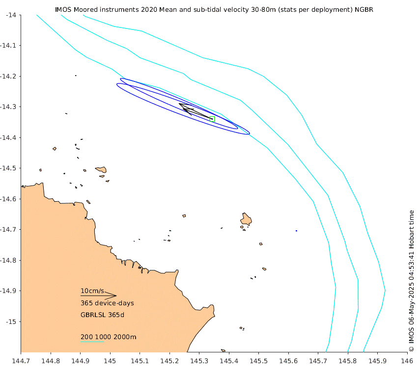 These maps show some basic analyses of the velocity data: mean (all-time in black and seasonal in colour) and sub-tidal variance for several layers and time-windows, and tidal harmonics for the depth-average velocity using the whole record. Click through to see more detailed plots of the selected dataset or to download those data from the AODN thredds server.