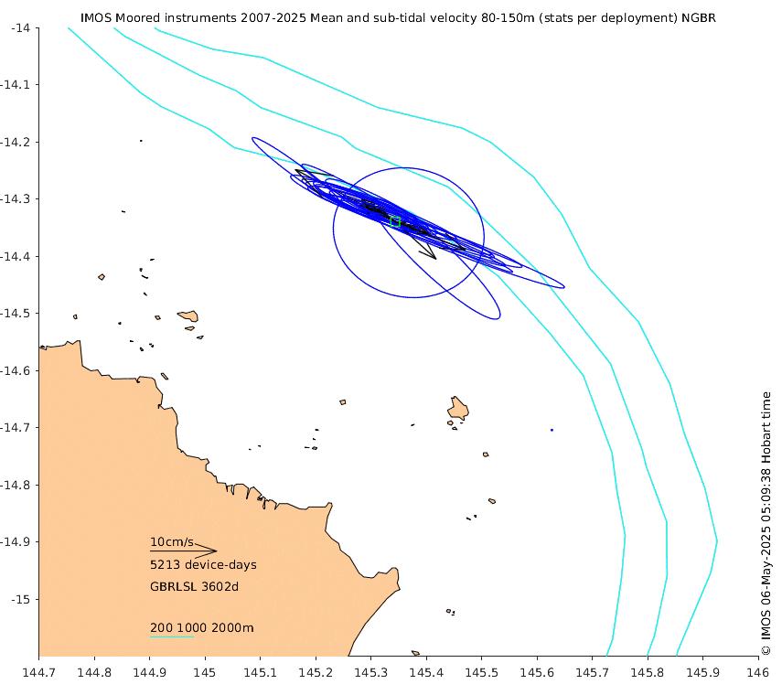 These maps show some basic analyses of the velocity data: mean (all-time in black and seasonal in colour) and sub-tidal variance for several layers and time-windows, and tidal harmonics for the depth-average velocity using the whole record. Click through to see more detailed plots of the selected dataset or to download those data from the AODN thredds server.