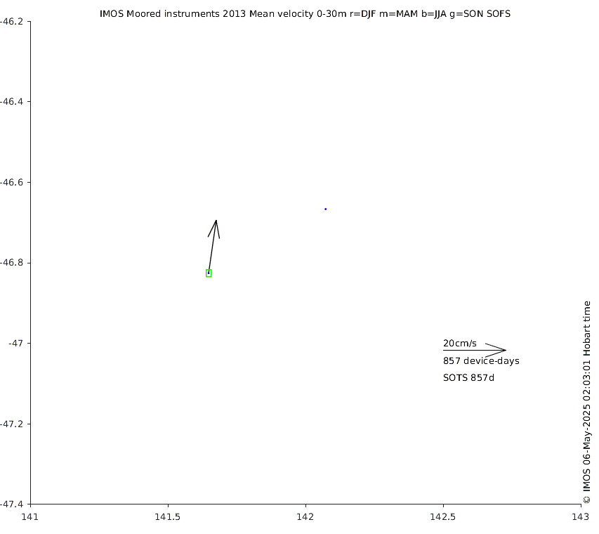 These maps show some basic analyses of the velocity data: mean (all-time in black and seasonal in colour) and sub-tidal variance for several layers and time-windows, and tidal harmonics for the depth-average velocity using the whole record. Click through to see more detailed plots of the selected dataset or to download those data from the AODN thredds server.