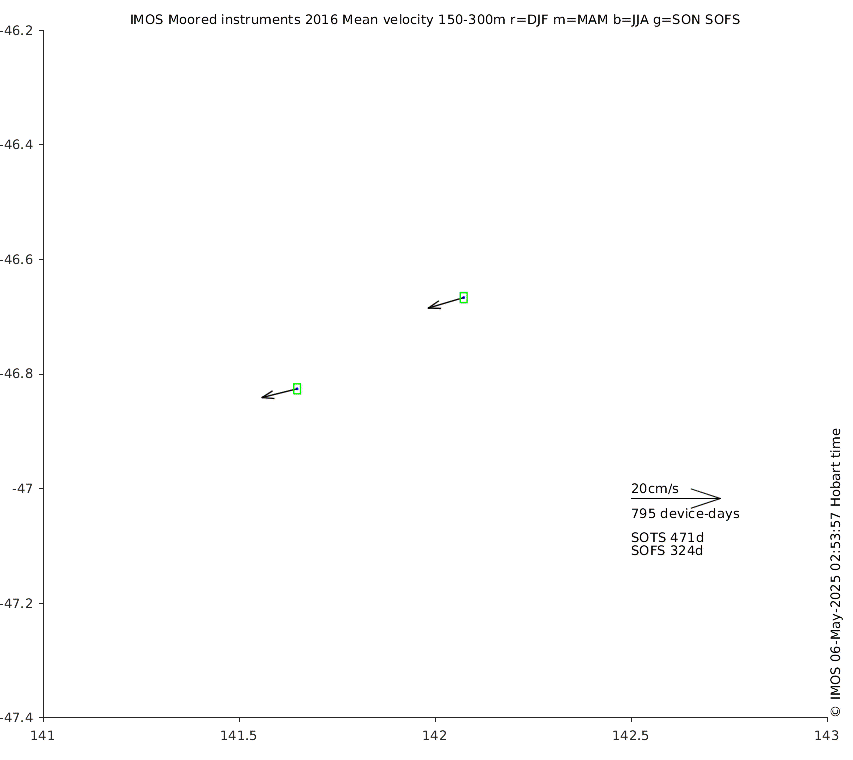 These maps show some basic analyses of the velocity data: mean (all-time in black and seasonal in colour) and sub-tidal variance for several layers and time-windows, and tidal harmonics for the depth-average velocity using the whole record. Click through to see more detailed plots of the selected dataset or to download those data from the AODN thredds server.
