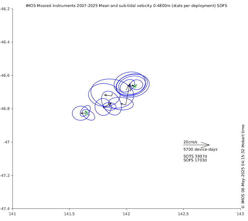 These maps show some basic analyses of the velocity data: mean (all-time in black and seasonal in colour) and sub-tidal variance for several layers and time-windows, and tidal harmonics for the depth-average velocity using the whole record. Click through to see more detailed plots of the selected dataset or to download those data from the AODN thredds server.