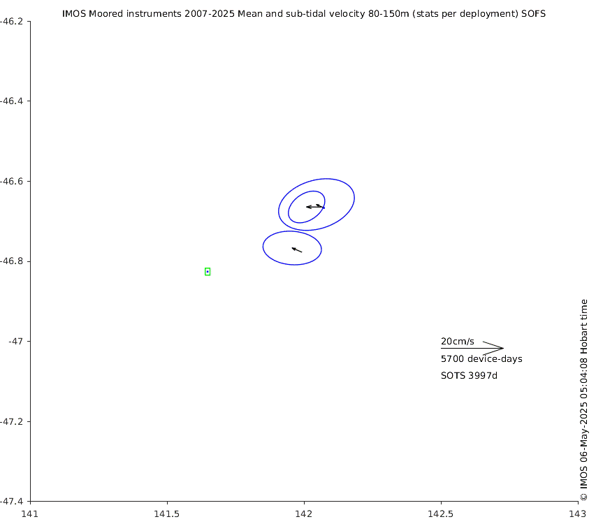 These maps show some basic analyses of the velocity data: mean (all-time in black and seasonal in colour) and sub-tidal variance for several layers and time-windows, and tidal harmonics for the depth-average velocity using the whole record. Click through to see more detailed plots of the selected dataset or to download those data from the AODN thredds server.
