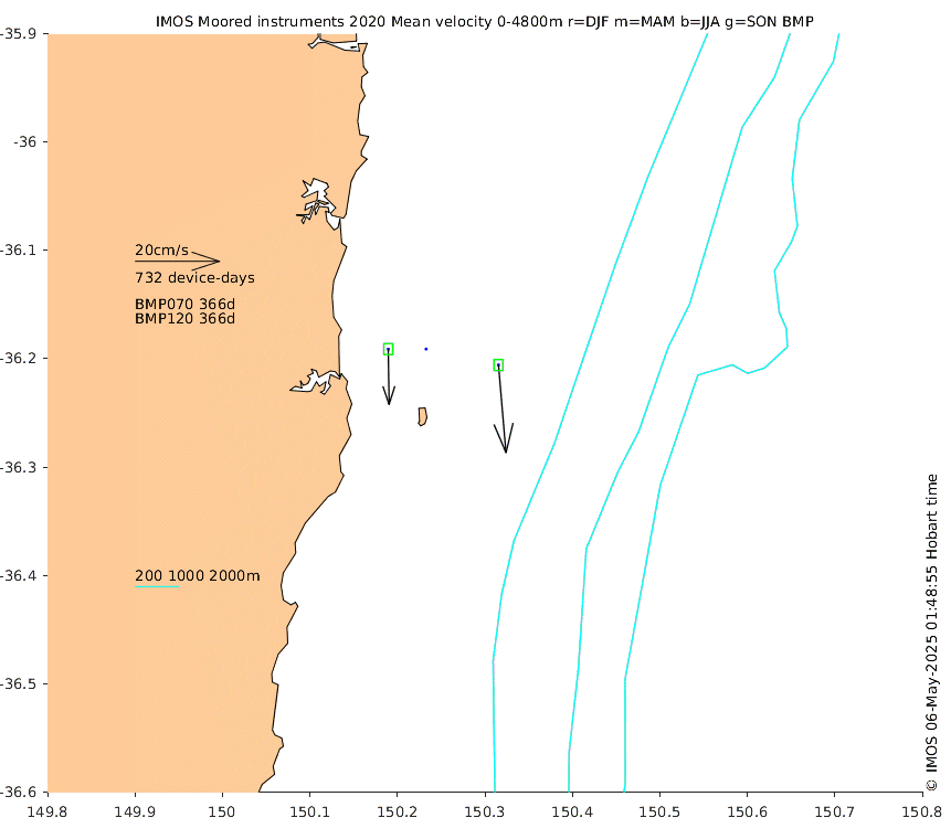 These maps show some basic analyses of the velocity data: mean (all-time in black and seasonal in colour) and sub-tidal variance for several layers and time-windows, and tidal harmonics for the depth-average velocity using the whole record. Click through to see more detailed plots of the selected dataset or to download those data from the AODN thredds server.