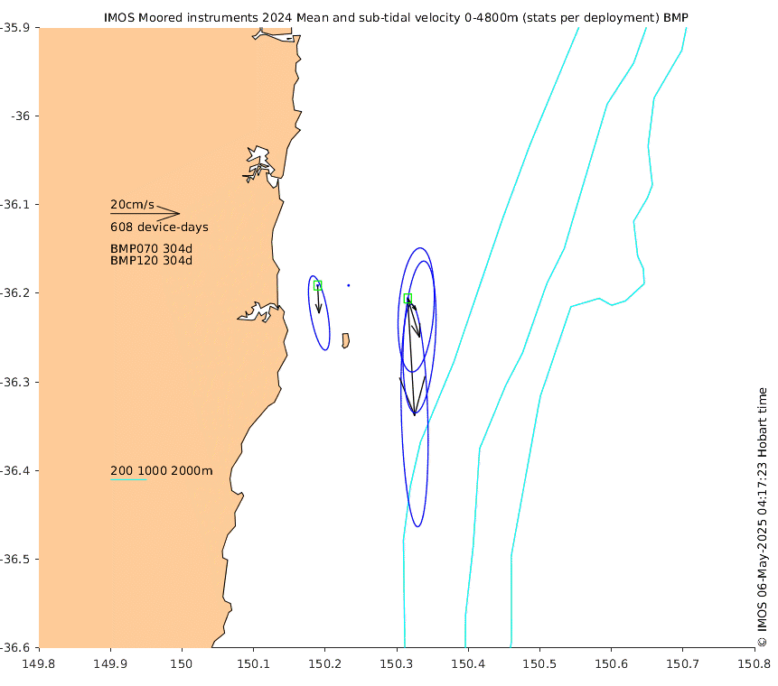 These maps show some basic analyses of the velocity data: mean (all-time in black and seasonal in colour) and sub-tidal variance for several layers and time-windows, and tidal harmonics for the depth-average velocity using the whole record. Click through to see more detailed plots of the selected dataset or to download those data from the AODN thredds server.