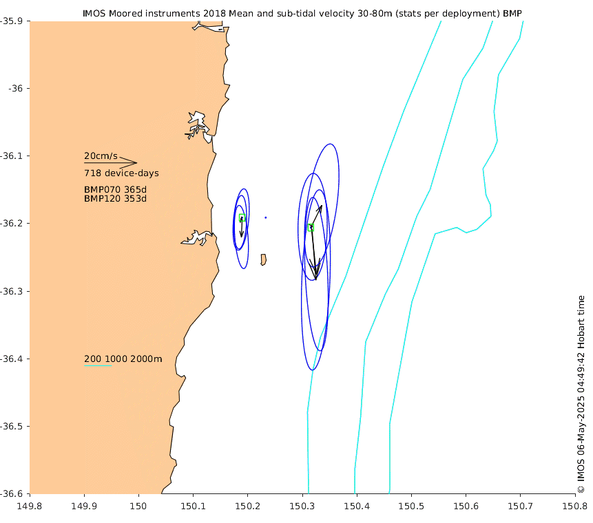 These maps show some basic analyses of the velocity data: mean (all-time in black and seasonal in colour) and sub-tidal variance for several layers and time-windows, and tidal harmonics for the depth-average velocity using the whole record. Click through to see more detailed plots of the selected dataset or to download those data from the AODN thredds server.