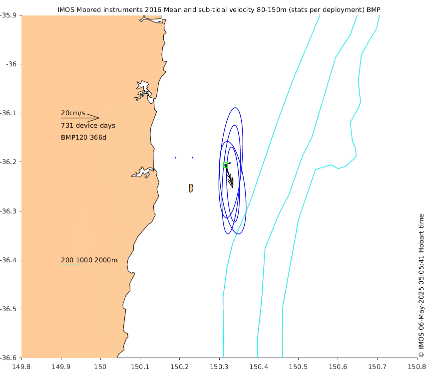 These maps show some basic analyses of the velocity data: mean (all-time in black and seasonal in colour) and sub-tidal variance for several layers and time-windows, and tidal harmonics for the depth-average velocity using the whole record. Click through to see more detailed plots of the selected dataset or to download those data from the AODN thredds server.