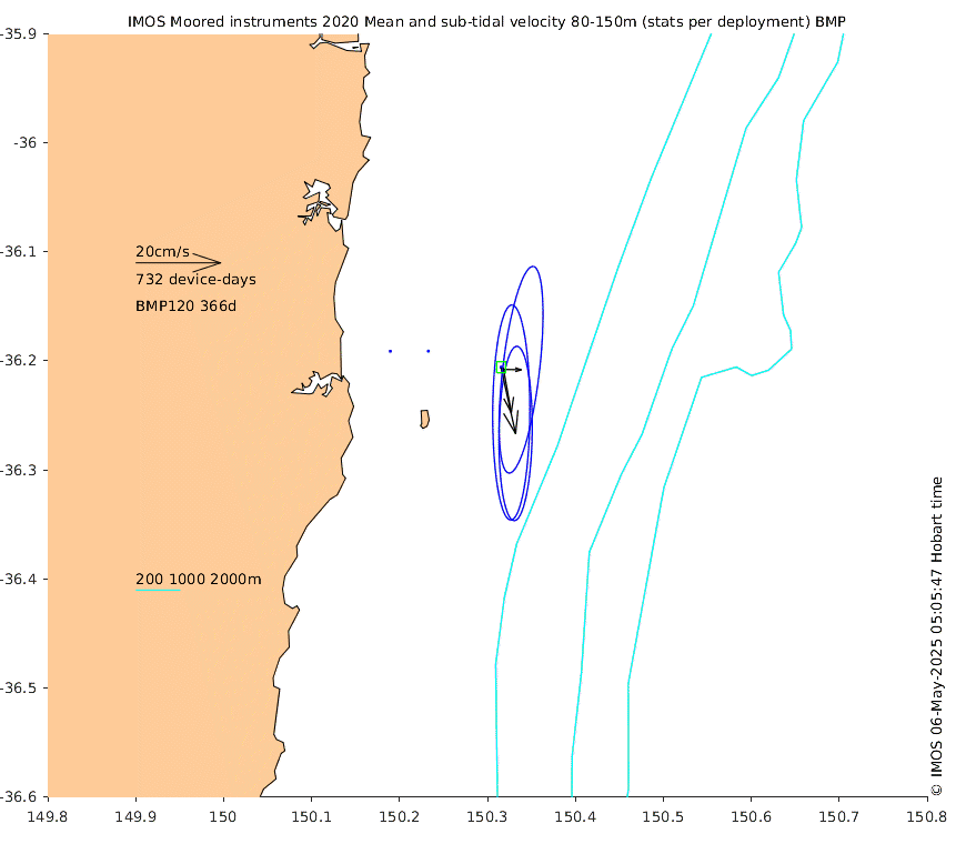 These maps show some basic analyses of the velocity data: mean (all-time in black and seasonal in colour) and sub-tidal variance for several layers and time-windows, and tidal harmonics for the depth-average velocity using the whole record. Click through to see more detailed plots of the selected dataset or to download those data from the AODN thredds server.