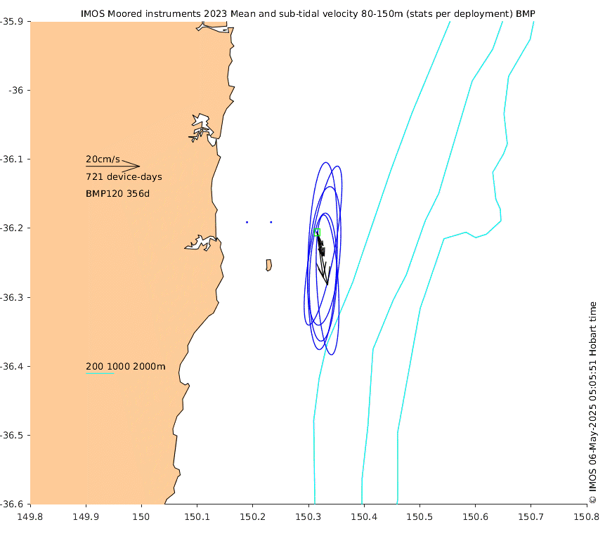 These maps show some basic analyses of the velocity data: mean (all-time in black and seasonal in colour) and sub-tidal variance for several layers and time-windows, and tidal harmonics for the depth-average velocity using the whole record. Click through to see more detailed plots of the selected dataset or to download those data from the AODN thredds server.