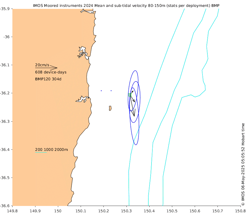 These maps show some basic analyses of the velocity data: mean (all-time in black and seasonal in colour) and sub-tidal variance for several layers and time-windows, and tidal harmonics for the depth-average velocity using the whole record. Click through to see more detailed plots of the selected dataset or to download those data from the AODN thredds server.