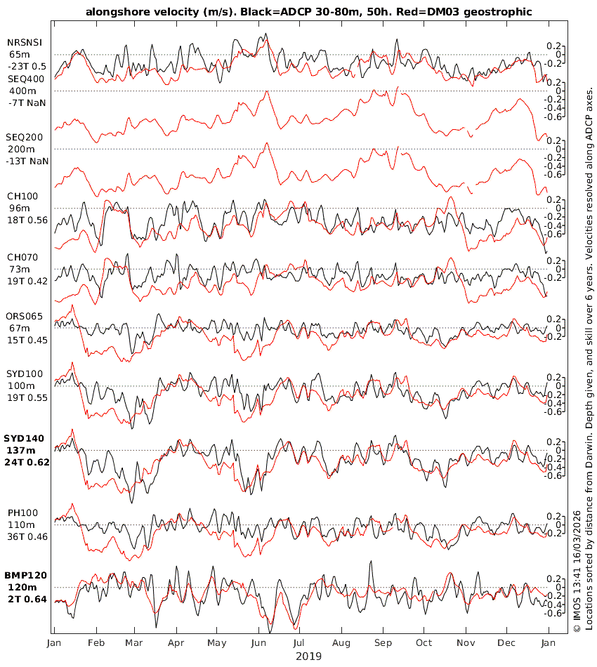 These plots of the DM03 estimates and ADCP observations of the alongshore component of near-surface, sub-tidal velocity (neither de-meaned) step through the years from 2009 to 2025, and through all the ADCPs, sorted by distance from Darwin. Station codes (see previous section for locations), water depth, alongshore-axis direction and skill (evaluated over 6 years, not just the year shown) are listed. Results: In the example at left (click it to see other years and groups of locations) we see two cases where the skill is relatively high (0.65, see names in bold, locations: SYD140 and BMP120). Inspection of the time series is consistent with the quantitative estimate of skill: the correspondence of the DM03 and ADCP velocities is clearly good. What the skill measure does not convey is that good agreement is seen for both the weather-band (periods of several days) and eddy-band (periods of a month or two) velocity variations of up to 1m/s (see June 2019 at BMP120 and the 4 periods of strong southward flow at SYD140). Even higher skill (0.68 and 0.75) is seen at SAM2CP and SAM5CB (locations) where it is weather-band variability, with a bit of annual cycle that drive the high skill. Of all the ANMN ADCP locations, SEQ400 is one where the strongest currents have been measured. The unequal (ADCP and DM03) ellipse sizes says that the geostrophic estimates underestimate the ADCP observations. But measuring strong currents in deep water poses a technical challenge. The mooring line gets pushed over, so near-surface (0-100m) flow speeds exceeding about 1m/s go unmeasured, implying that the underestimation is, itself, underestimated. (See plot of depth and velocity vs time). The time series plots show that the geostrophic estimate of the southward surface current also never exceeded 1m/s in either 2012 or 2013 when the instruments were in place. This can only be a coincidence, because the two techniques are completely independent. Another interesting point is that the salient observation of a northward flow event (on 29 Oct 2012) was only estimated as a weakened southward flow at the location of the ADCP. Indeed, over the 2 years, only one (on 3 July 2012) of 5 northward flow events was correctly estimated in terms of magnitude as well as timing. Despite these imperfect results focussed on extreme events, the overall skill (0.61) was fairly high, and visually, the characteristic time-scale of variability is about right. It should also be noted that a map view of the 29 Oct 2012 event (showing northward flow in shallower water) leaves a different impression to the time series view, because our eyes are more tolerant of errors of exact placement. We end this short discussion of results with an example of a location where high skill (0.7) is driven primarily by annual-timescale variation of current strength: GBRMYR (location, time series), and hope that readers find other stations of interest to them in the archive of plots. |