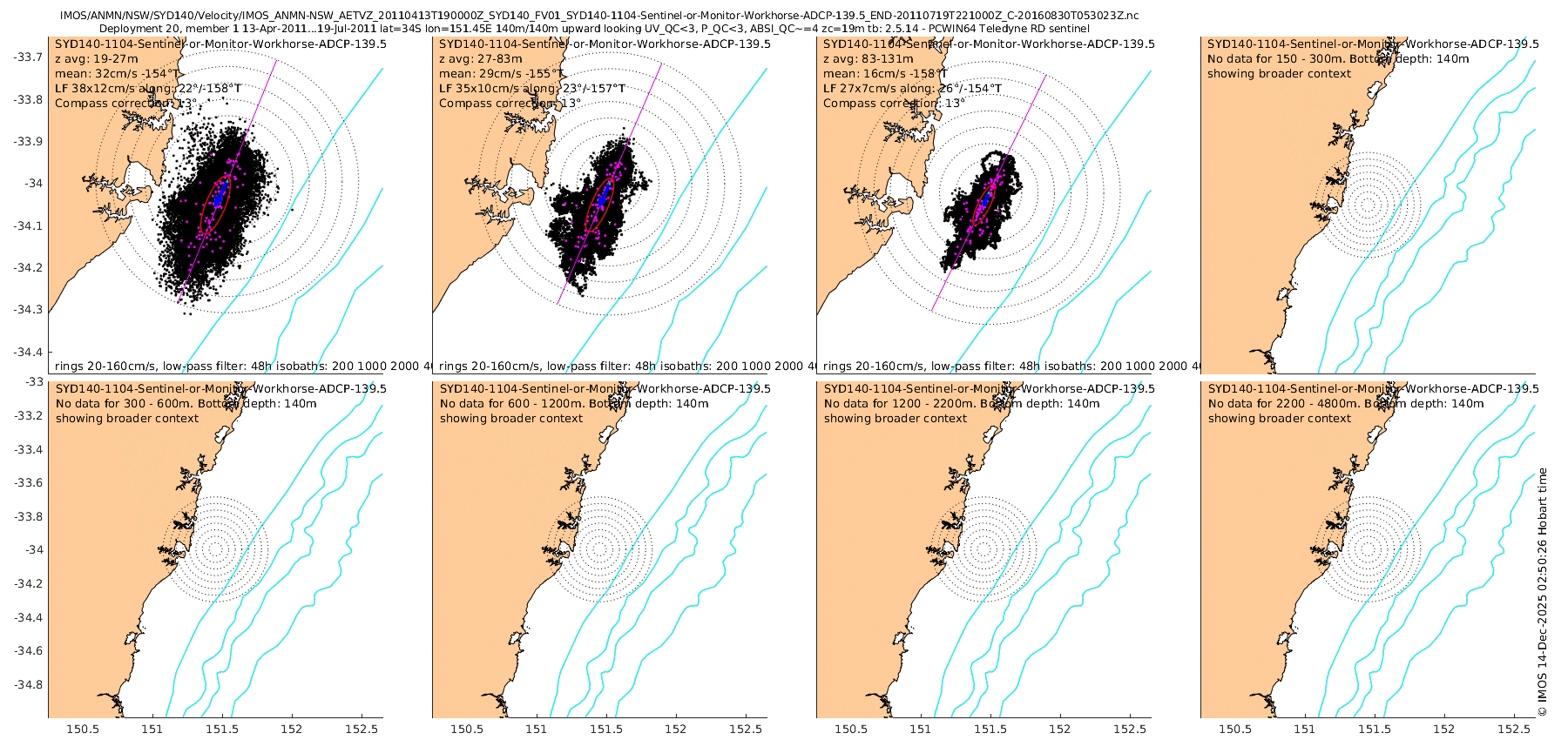 21 Jan 2015 Non-ADCP current meter (Acoustic Doppler Velocimeter, or ADV) data are now shown in addition to ANMN and DWM ADCP data. We now also show the Satellite Remote Sensing Altimeter Calibration sub-facility SRS-ALT ADV data. The DWM ADV data are very numerous so they are plotted separately. Some are much deeper than the ADCPs so we have defined a new set of 8 depth-strata for windowing the data.