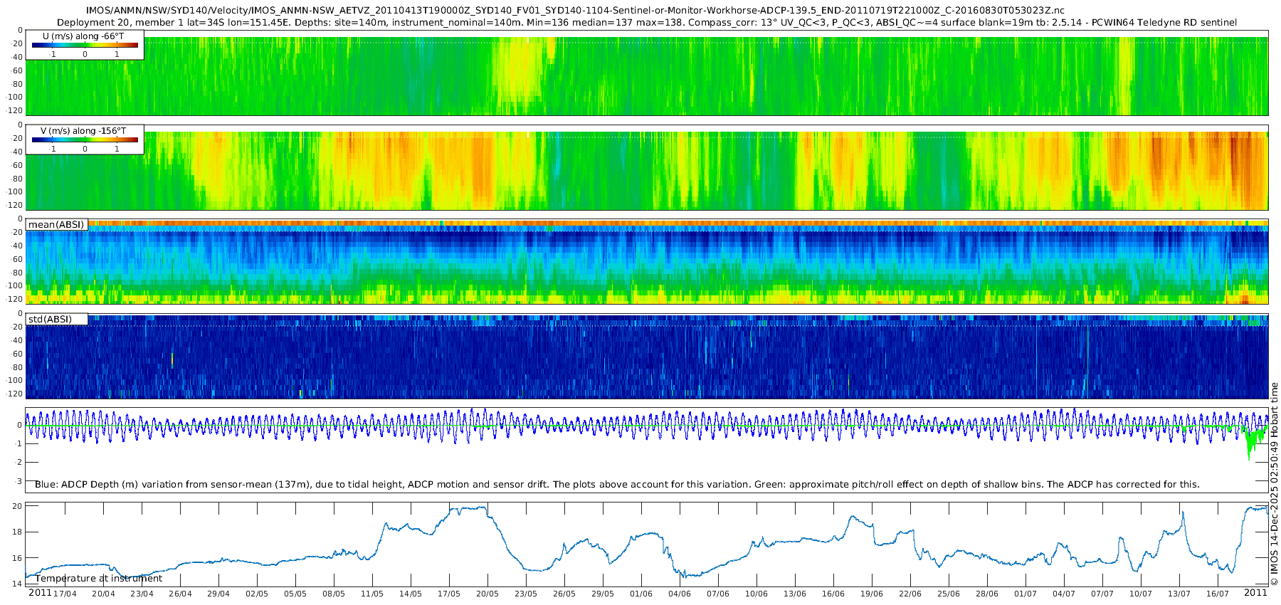 14 Mar 2017 Another year of new and/or re-processed ANMN data have now been added to our suite of plots. All 594 instrument deployments have been reloaded from the THREDDS server to ensure that they are current. Users should note that some data files in the archive still have erroneous or missing location, timezone (AEST when metadata says UTC) or magnetic declination information. These files, and the identified issues are listed in the text index. The time corrections and magnetic declinations we have used are all listed in the updated [details table].