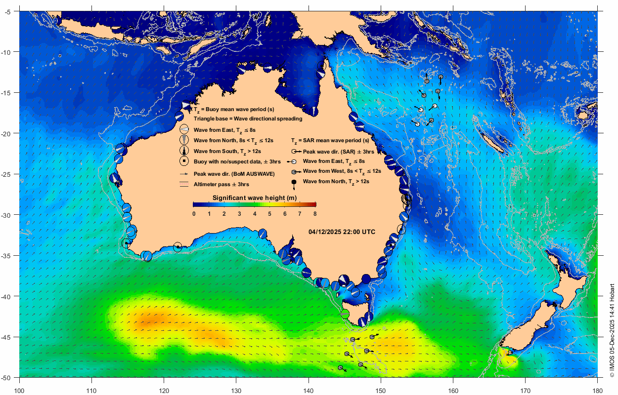• Wave measurements from Australia's coastal wave buoy network at t0 +/- 3 hrs, extracted from AODN's near real time feed of the national waverider buoys observations.