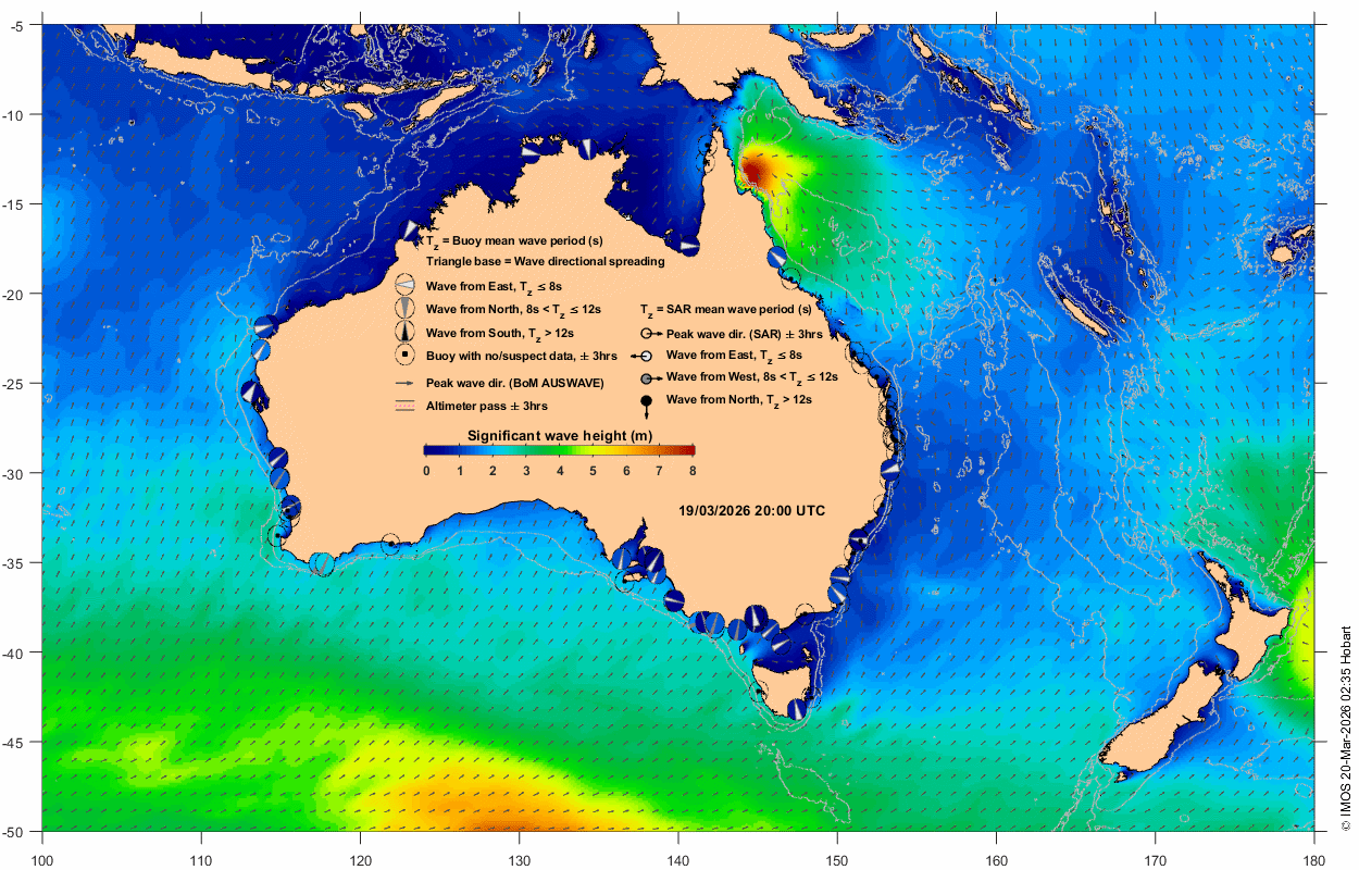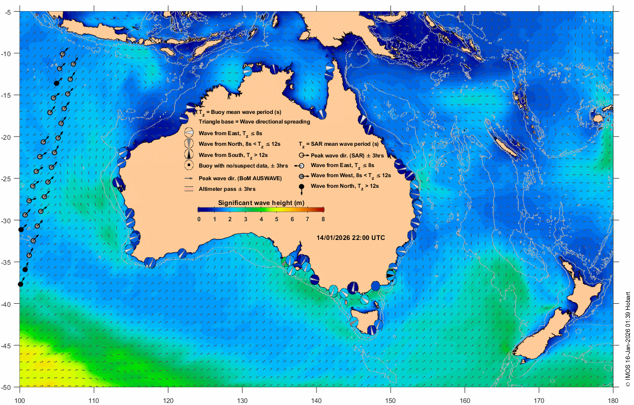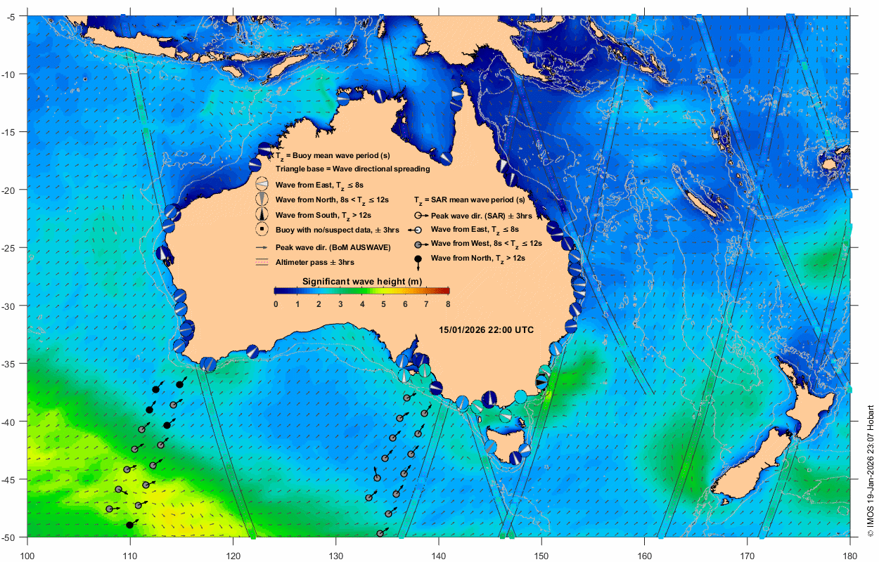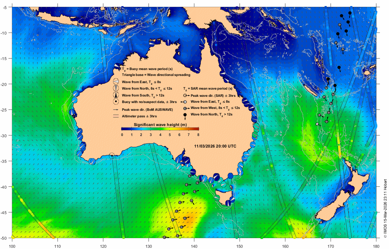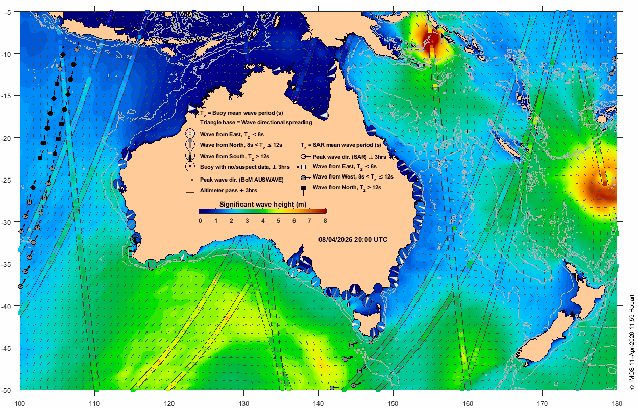Wave buoy: circle near Australian coastline at location of wave buoy displaying measurement in the window t0 +/- 3 hrs. The colour shown inside the circles (colourbar) represents significant wave height (SWH). The wedge in the middle indicates wave direction, with the wave coming from the broad side of wedge. The wedge thickness represents directional spread, and its colour (white, grey, black) represents three regimes of mean wave period in sec (Tz ≤ 8, 8 < Tz ≤ 12, Tz > 12, respectively). An empty circle with a dot in the middle represents absent or suspect data. Data are classed as suspect if SWH is greater than twice the maximum wave height.
