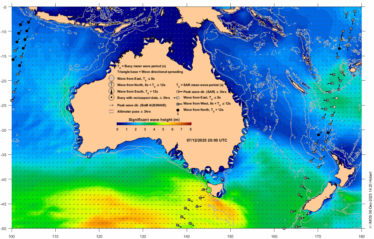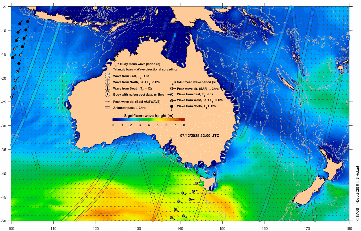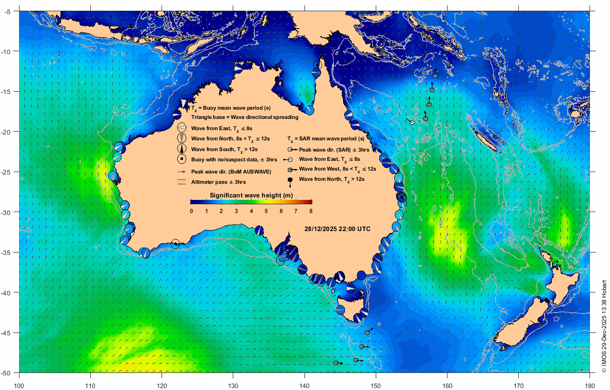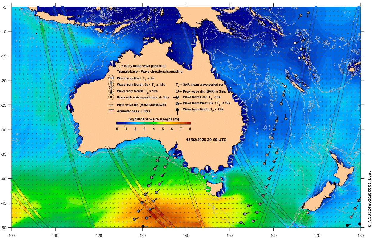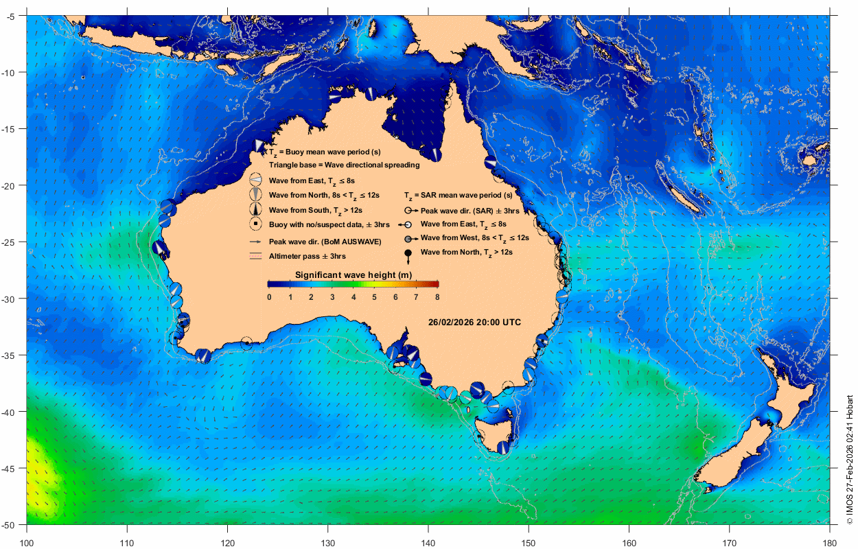 Wave buoy: circle near Australian coastline at location of wave buoy displaying measurement in the window t0 +/- 3 hrs. The colour shown inside the circles (colourbar) represents significant wave height (SWH). The wedge in the middle indicates wave direction, with the wave coming from the broad side of wedge. The wedge thickness represents directional spread, and its colour (white, grey, black) represents three regimes of mean wave period in sec (Tz ≤ 8, 8 < Tz ≤ 12, Tz > 12, respectively). An empty circle with a dot in the middle represents absent or suspect data. Data are classed as suspect if SWH is greater than twice the maximum wave height.