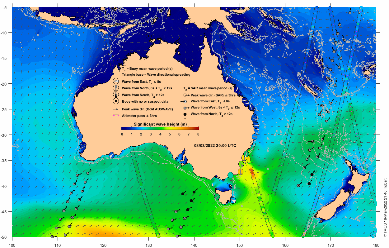 • Wave measurements from Australia's coastal wave buoy network at t0 +/- 3 hrs, extracted from AODN's near real time feed of the national waverider buoys observations.