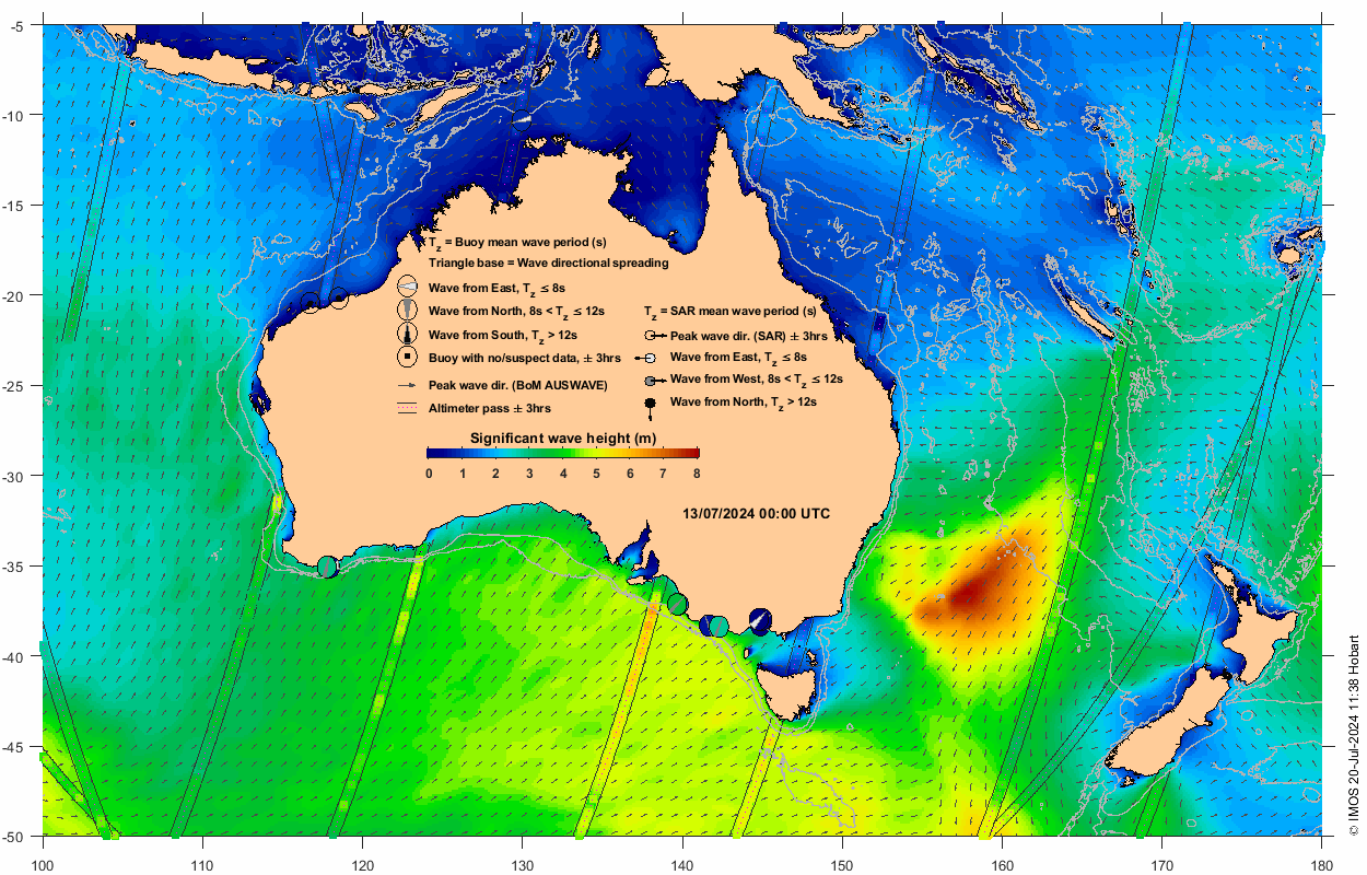 Wave buoy: circle near Australian coastline at location of wave buoy displaying measurement in the window t0 +/- 3 hrs. The colour shown inside the circles (colourbar) represents significant wave height (SWH). The wedge in the middle indicates wave direction, with the wave coming from the broad side of wedge. The wedge thickness represents directional spread, and its colour (white, grey, black) represents three regimes of mean wave period in sec (Tz ≤ 8, 8 < Tz ≤ 12, Tz > 12, respectively). An empty circle with a dot in the middle represents absent or suspect data. Data are classed as suspect if SWH is greater than twice the maximum wave height.